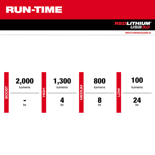 3 Modes: High: 1,300- Lumens- 4 hrs; Medium: 800- Lumens- 8 hrs; Low: 100-Lumens- 24 hrs
