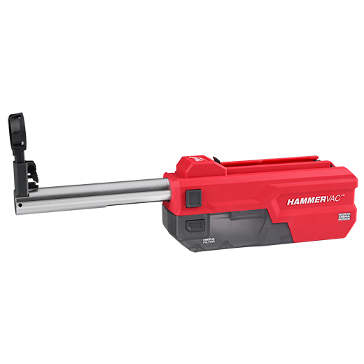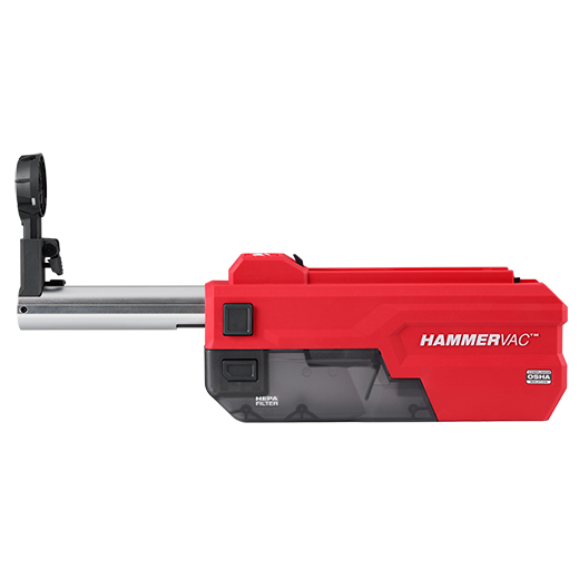 Our HAMMERVAC™ 1-1/4” Dedicated Dust Extractor features an inline design engineered to connect directly to and be powered by our MILWAUKEE® M18 FUEL™ 1-1/4” SDS Plus D-Handle Rotary Hammer w/ ONE-KEY™. Utilizing the same replaceable certified HEPA filter as other HAMMERVACS™, which filters 99.97% of all particles greater than 0.3µm, means more compatibility on the jobsite. The built-in adjustable depth stop and ruler offer easy and precise adjustments. Our dust extractor allows full OSHA Table One Compliance when drilling up to 1-1/4” in diameter and 8” in depth. This extractor features our AUTOPULSE™ Filter Cleaning Mechanism that automatically cleans the filter after each use, ensuring our users are able to drill more effectively and for longer before needing to empty the dust box. The dust box comes equipped with a vacuum port that allows our users to suction out the dust with a large vacuum or dust extractor instead of dumping the dust out into a trash receptacle, ensuring minimal exposure.