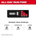 Up to (8) hours of run-time with the M12™ REDLITHIUM™ CP2.0 Compact Battery Pack on low setting